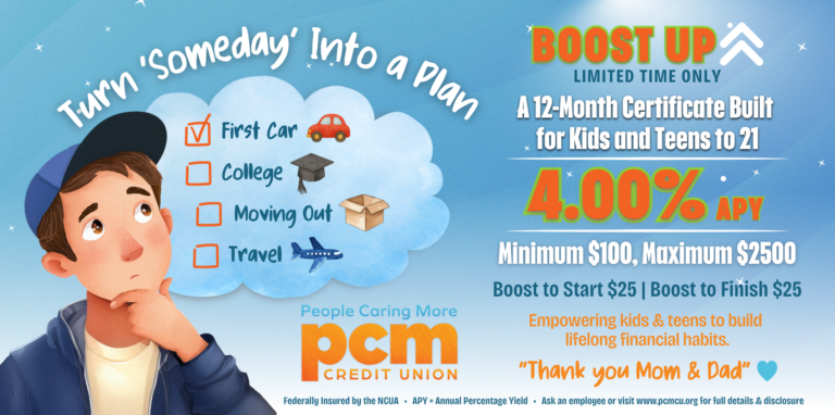*APY=Annual Percentage Yield, Dividend Rate 3.93%. This limited time promotional offer is available for Share Certificates only, following age requirements. All accounts are subject to approval and require a Share Savings to be opened with $5 minimum deposit. All primary minor accounts under age 18 must have a parent or guardian as a joint owner. Custodial accounts under UTMA do not qualify for this promotion. PCMCU reserves the right to change this offer at any time and without notice. Member eligibility required. Federally insured by the NCUA.
