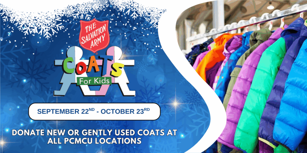 The Salvation Army’s Coats for Kids campaign runs September 22nd – October 23rd. All three PCMCU branches will be collecting new or gently used coats for those in need, from infants to teens. All sizes are welcome!