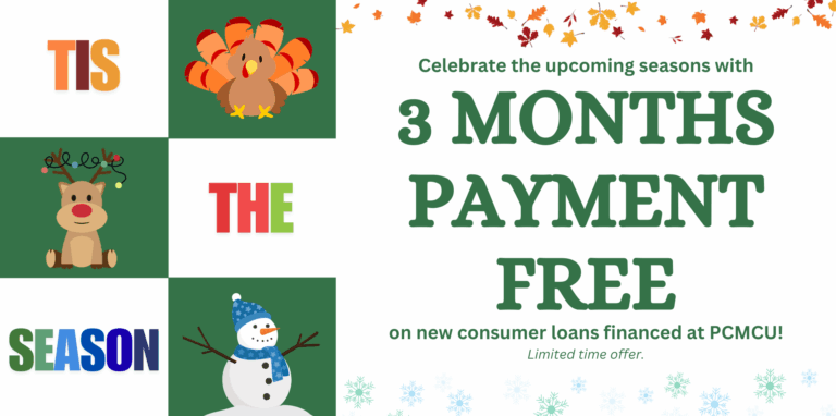 Offer applies to closed-end consumer loans only. Mortgage, home equity, Kwik Cash, balloon, and credit card loans are excluded. Membership eligibility required. Loan terms and conditions are based on credit qualifications and approval. $5,000 new money to PCM Credit Union required on secured consumer loans. $2,500 new money to PCM Credit Union required on unsecured consumer loans. First payment may be deferred up to 90 days on select loans. Finance charges begin accruing when loan is funded. Offer effective October 6, 2025. Rates, terms, and conditions are subject to change at any time, and this offer may end without notice. Please contact us to see if your loan qualifies.